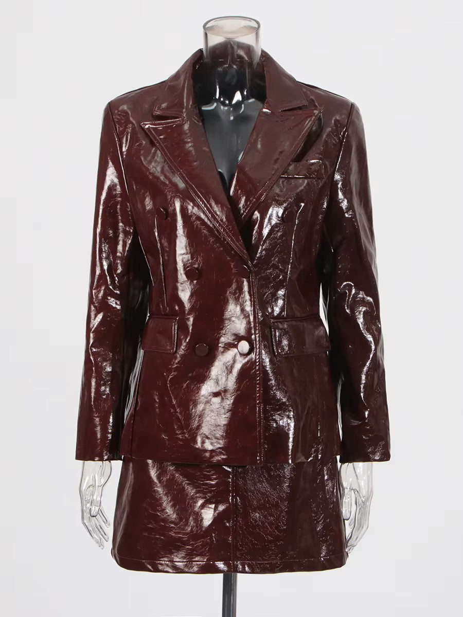 Vintage Lapel Double Breasted Faux Leather Blazer Two Piece
