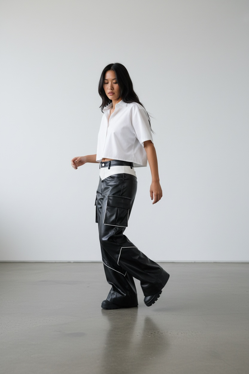 These black faux-leather cargo pants feature contrast white detailing that highlights every line of the silhouette, giving a structured and contemporary feel. The signature white waistband adds a unique two-tone effect that instantly sets them apart.
